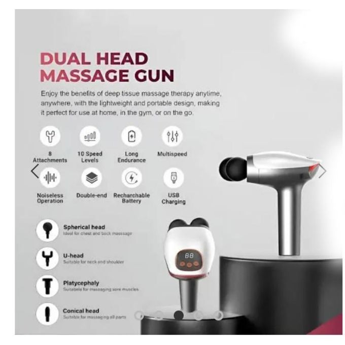 The Double Head Gun Massager is a powerful deep tissue massage device designed to relieve muscle stiffness, reduce soreness, and improve blood circulation. Featuring dual massage heads, it delivers a wider coverage area for faster and more effective muscle relaxation compared to standard massage guns. Ideal for athletes, gym-goers, and anyone dealing with daily body fatigue.